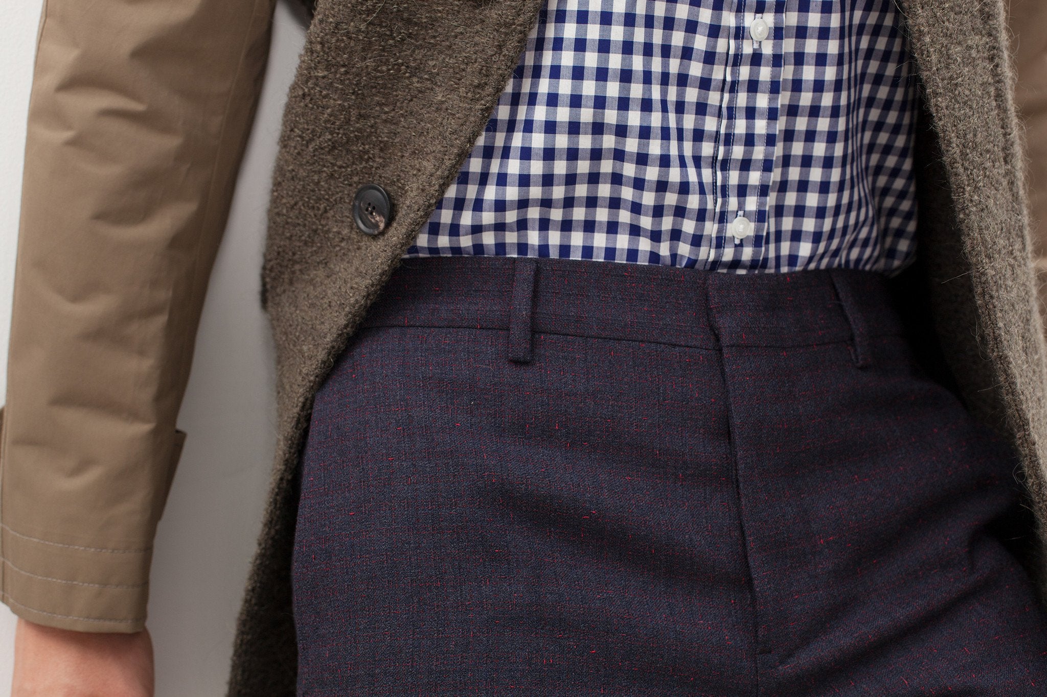 Classic boiled wool with weather proof nylon canvas. Strapped cuffs and raglan sleeves contrast a woolen front welt and patch pockets. Mauro Grifoni. Color Olive. Made in Italy.